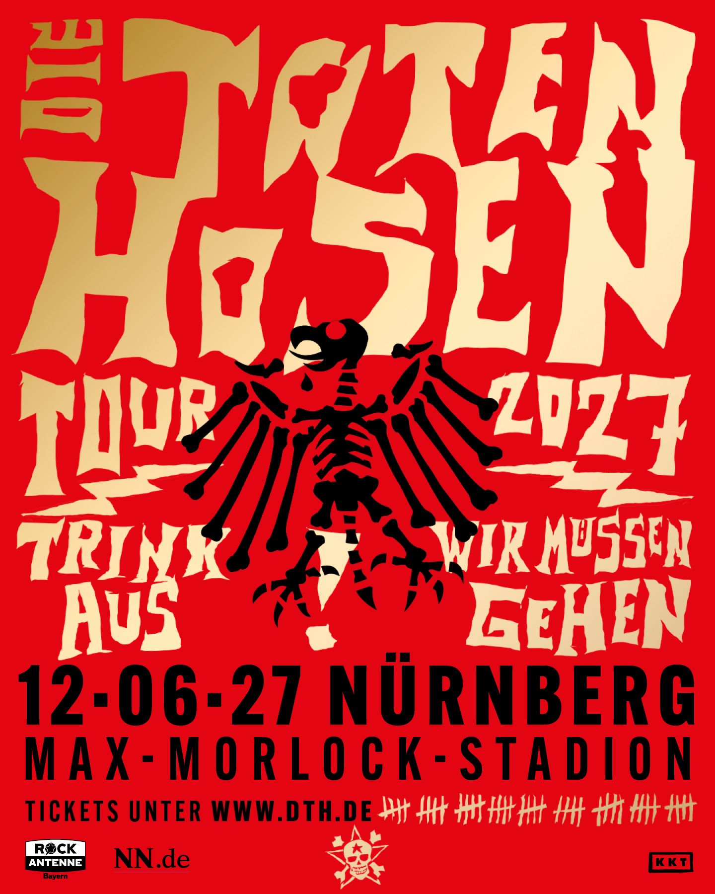 Nürnberg steht auch auf dem Tourplan – am Samstag, den 12.6.2027 im Max-Morlock-Stadion! Es ist eins von fünf Konzerten der Toten Hosen 2027 in Deutschland, es handelt sich um das einzige Konzert in Bayern 2027 – und neben Mannheim um das einzige in Süddeutschland. Im Nürnberger Stadion gibt es zudem Steh- UND Sitzplätze, bei bei den nächstliegenden Konzerten in Mannheim und Leipzig nur Stehplätze. Wir werden ja alle nicht jünger.